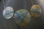 2009De drie schelp cirkels zijn met zijde bespannen in een doorlopend patroon. de schelpen zijn met zilver aan elkaar verbonden. Het collier sluit met een zilveren draad met zilveren sluiting.